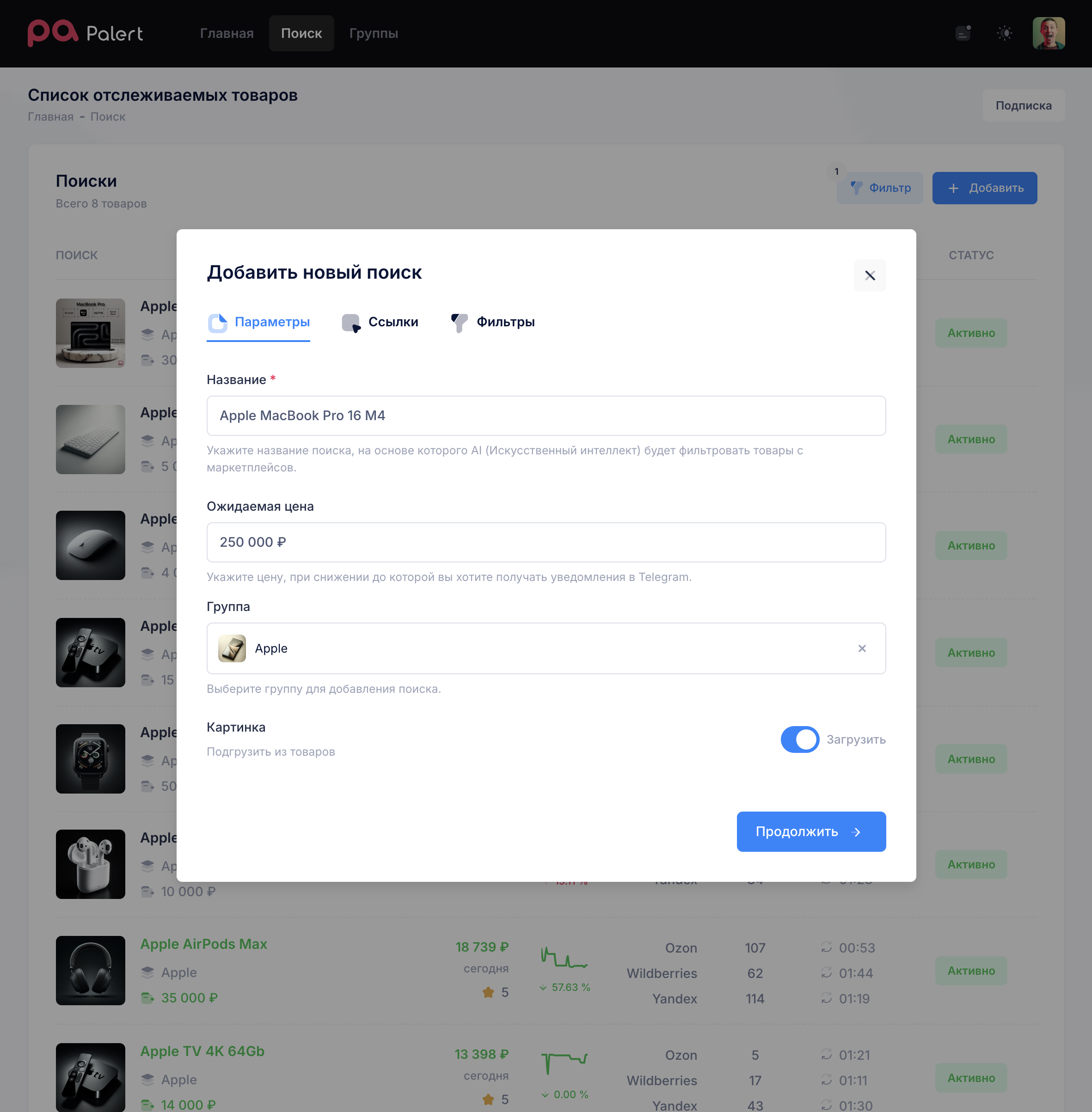 You add a link, SKU, or product name. Palert automatically tracks price changes on popular marketplaces and notifies you when the price drops to your target.